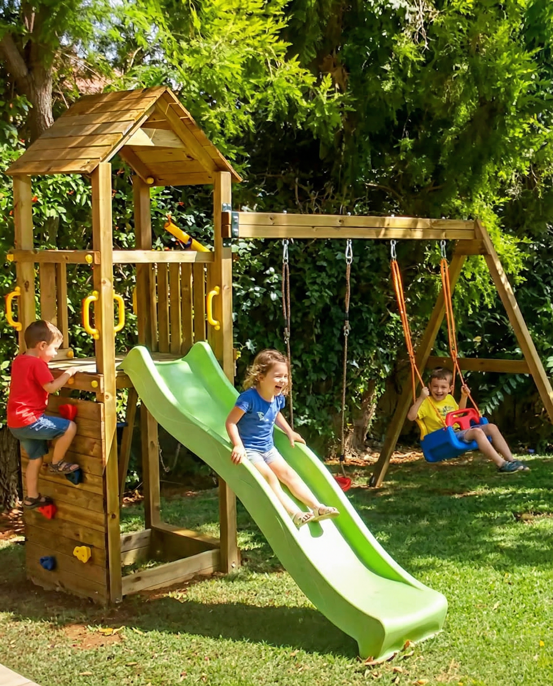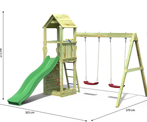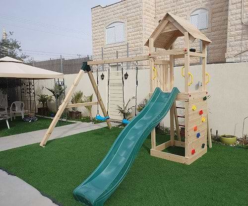 - כולל: מגלשה, שתי נדנדות, קיר טיפוס, סל קליעה וסולם אופקי