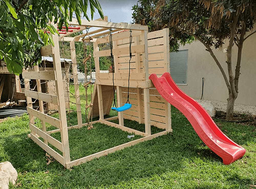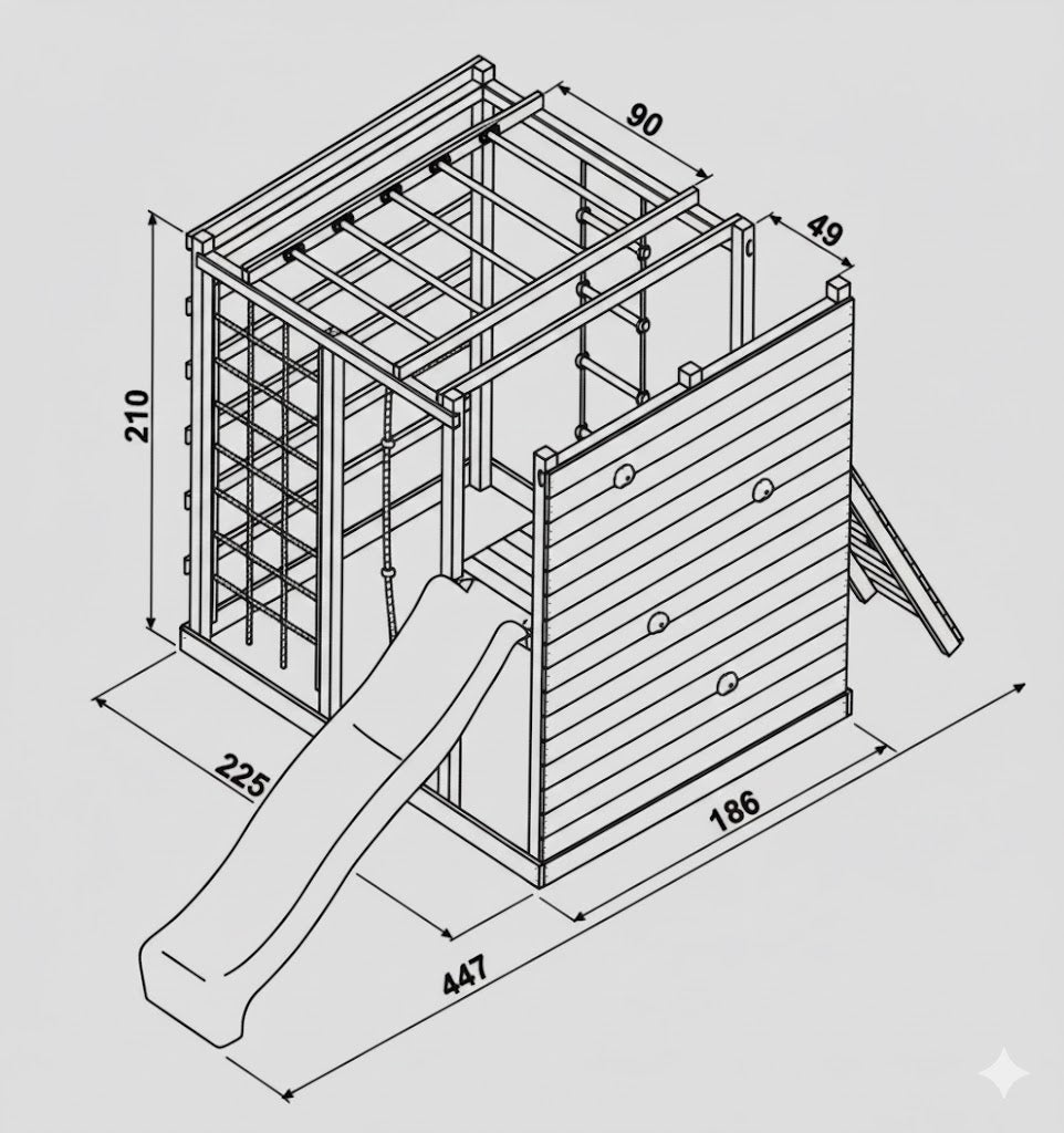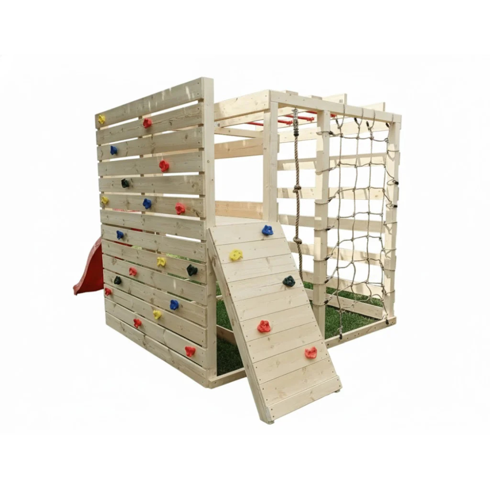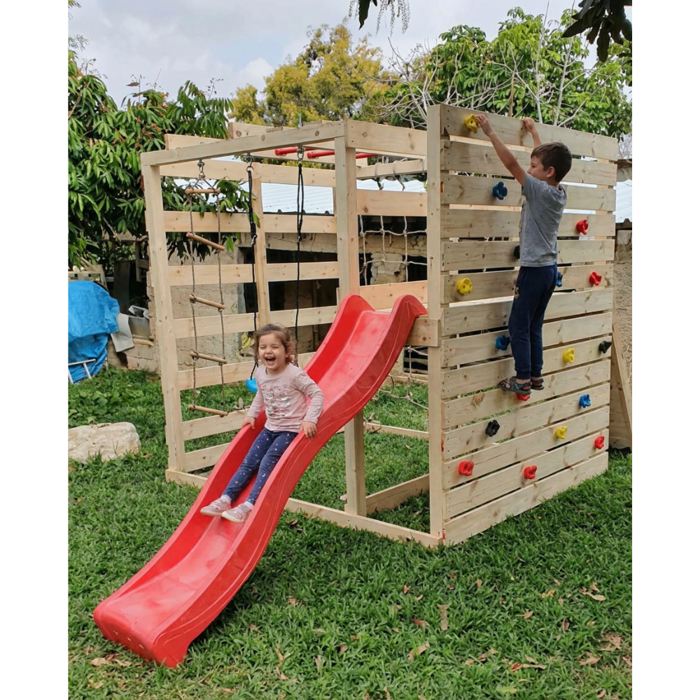 - כולל קיר טיפוס צוקים, מגלשה, סולם עץ ורשת טיפוס