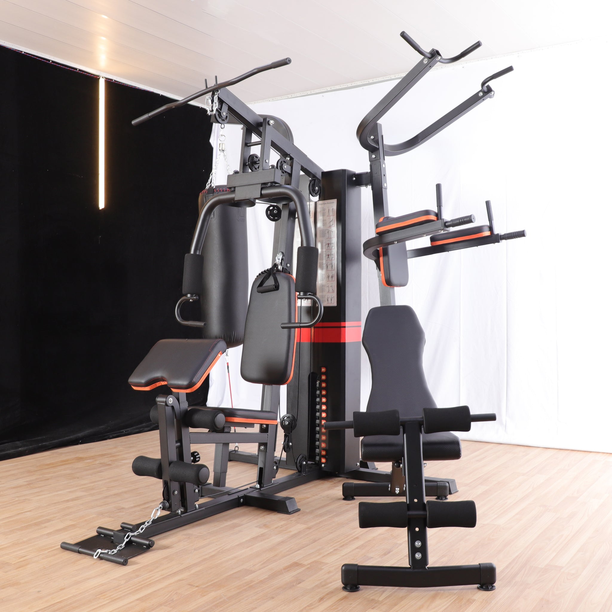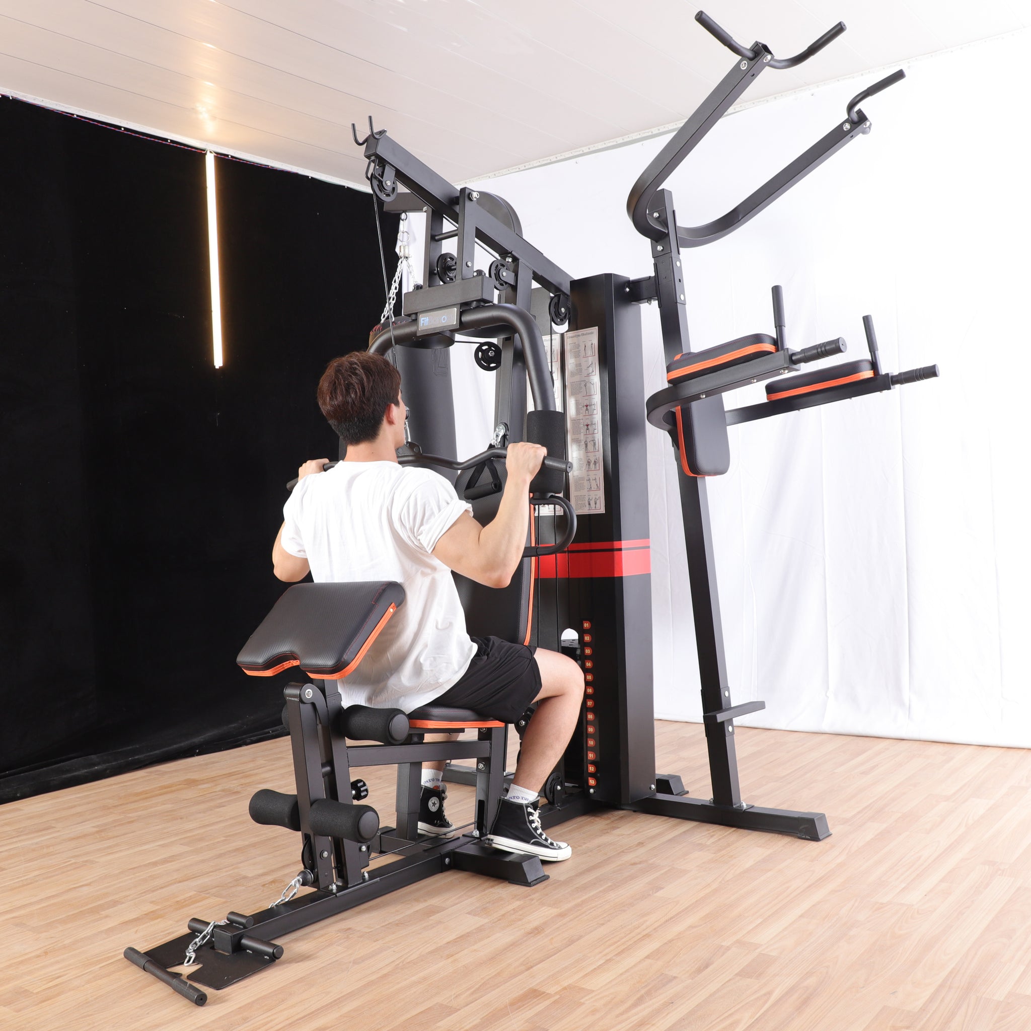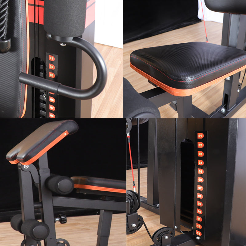 1. תחנה ראשית - התחנה כוללת 76 ק"ג משקולות במחסנית בעלת כיסוי חיצוני בטיחותי, התחנה מחולקת ל4 נקודות עבודה פולי עליון, פולי תחתון, פולי אמצעי ופשיטת ברכיים. תחנה זו לבדה יכולה להעניק לנו את האופציה לבצע עשרות תרגילים שונים כמעט לכל השרירים בגוף.