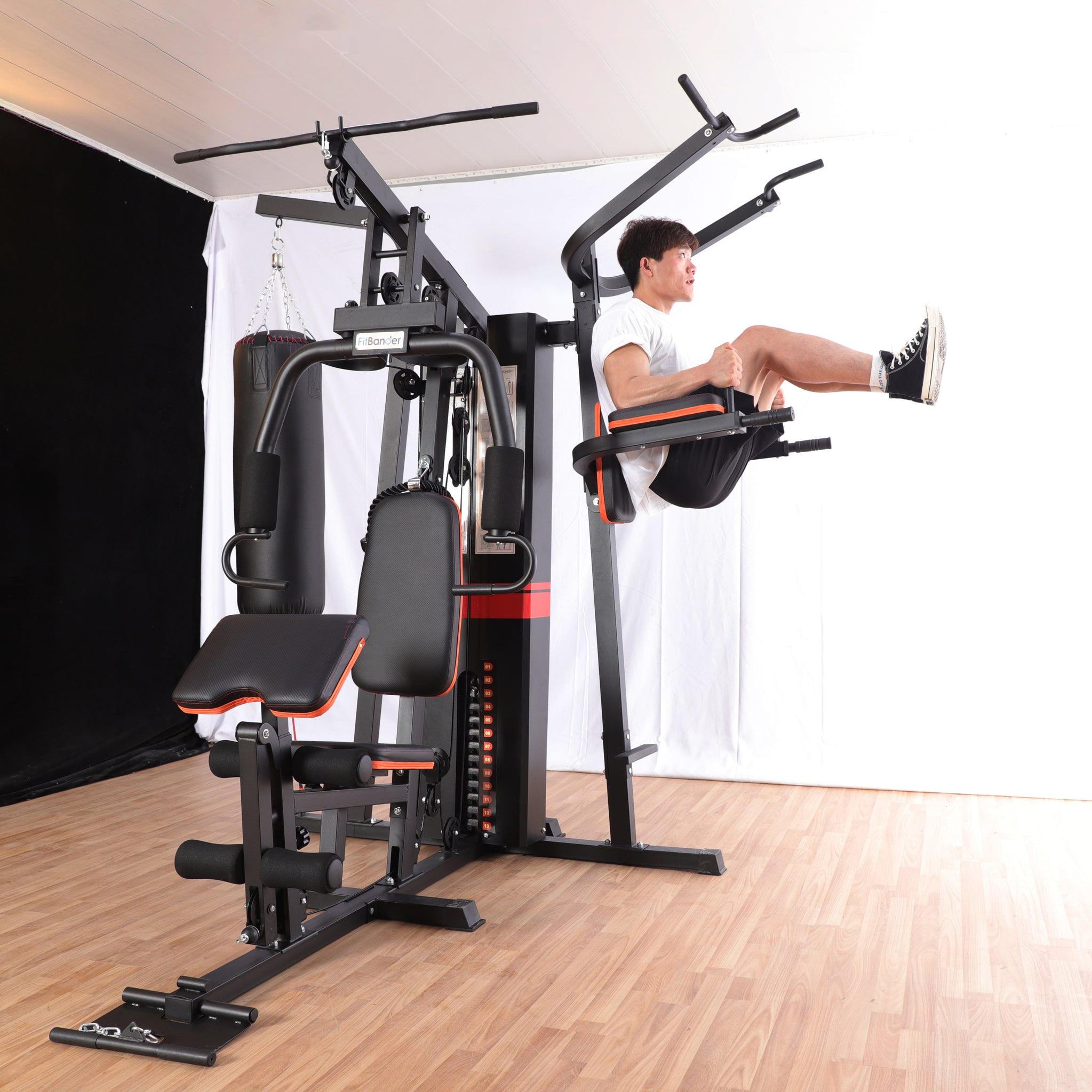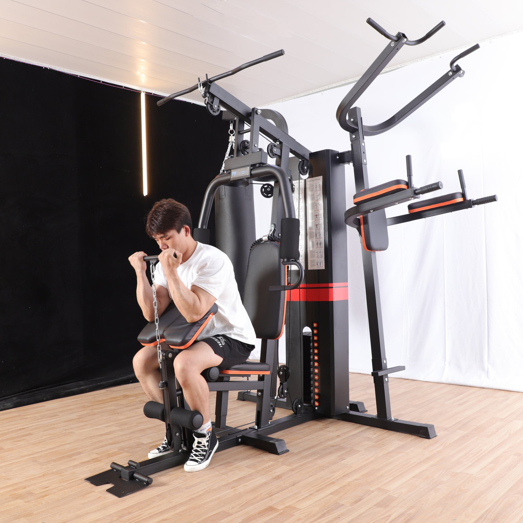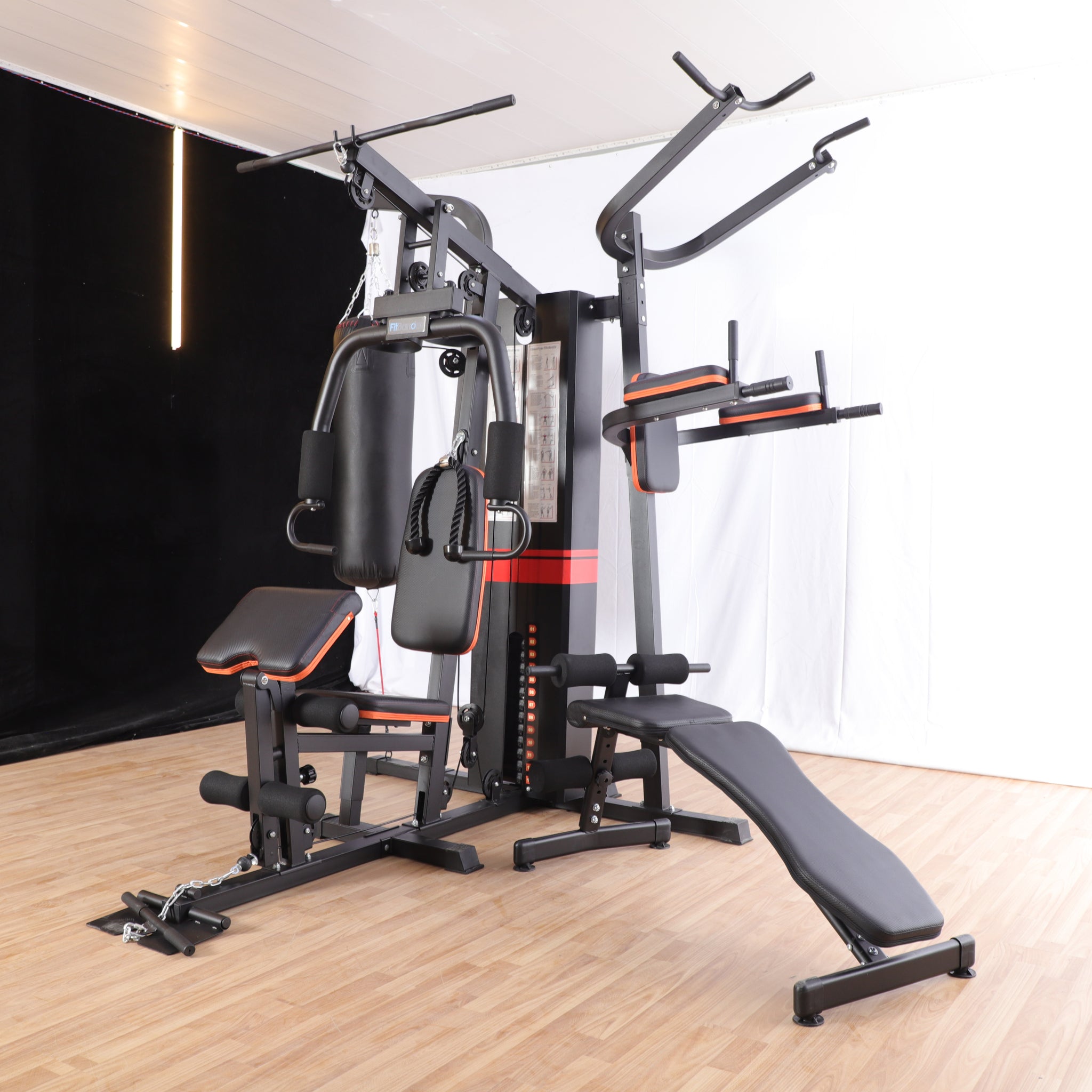 1. תחנה ראשית - התחנה כוללת 76 ק"ג משקולות במחסנית בעלת כיסוי חיצוני בטיחותי, התחנה מחולקת ל4 נקודות עבודה פולי עליון, פולי תחתון, פולי אמצעי ופשיטת ברכיים. תחנה זו לבדה יכולה להעניק לנו את האופציה לבצע עשרות תרגילים שונים כמעט לכל השרירים בגוף.